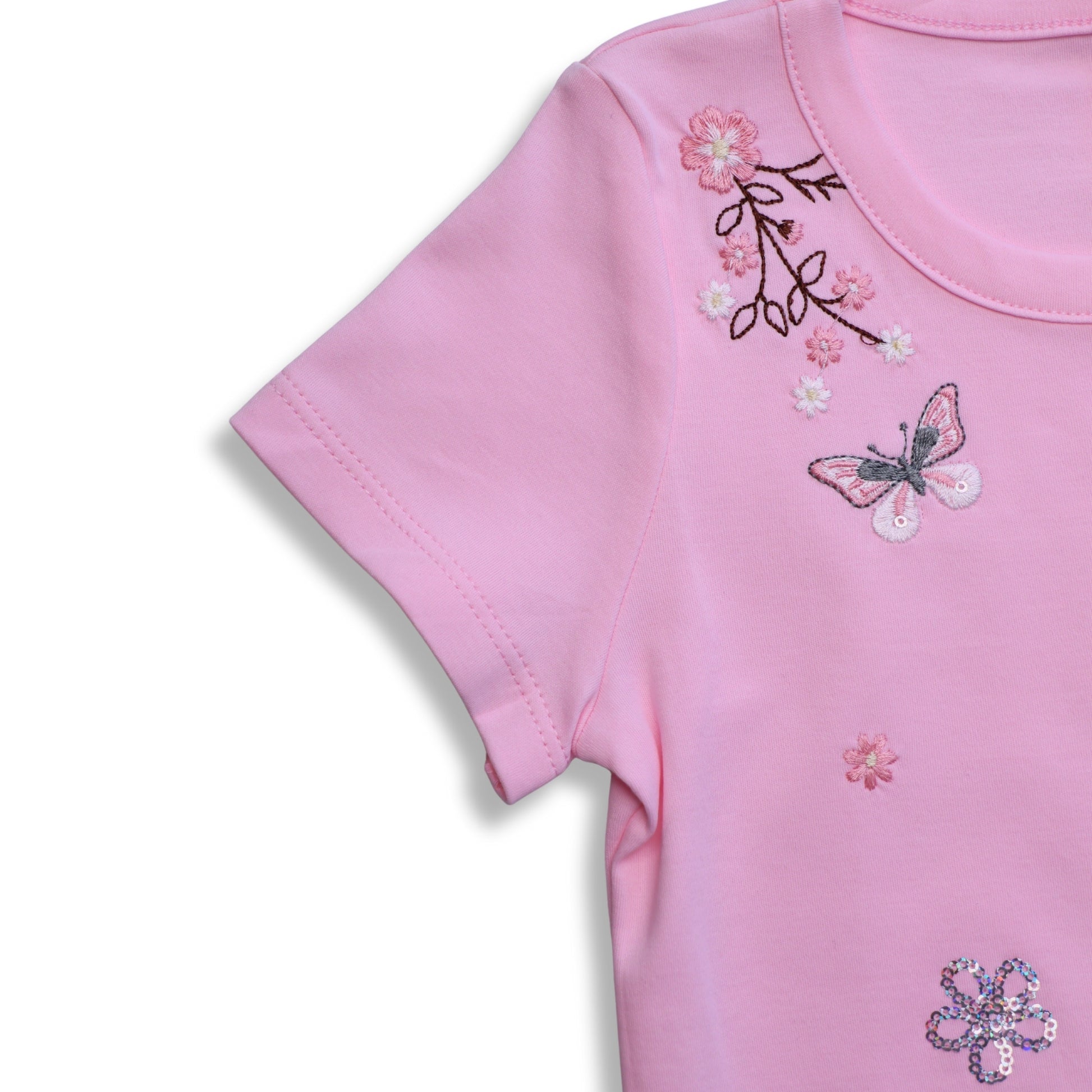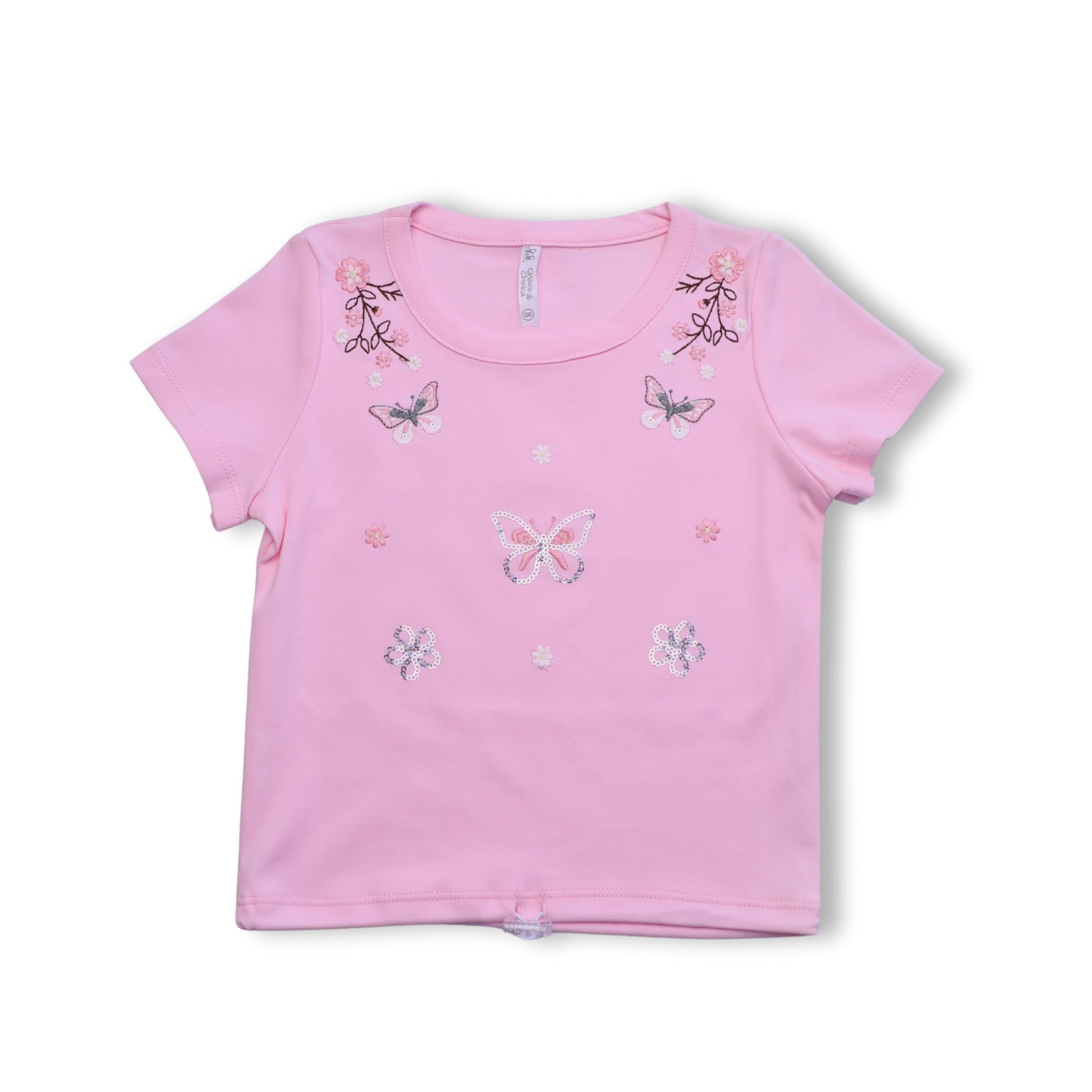 POLO DE NIÑA MANGA CORTA ROSADO CON AJUSTE EN LA CINTURA Y BORDADO DE MARIPOSAS