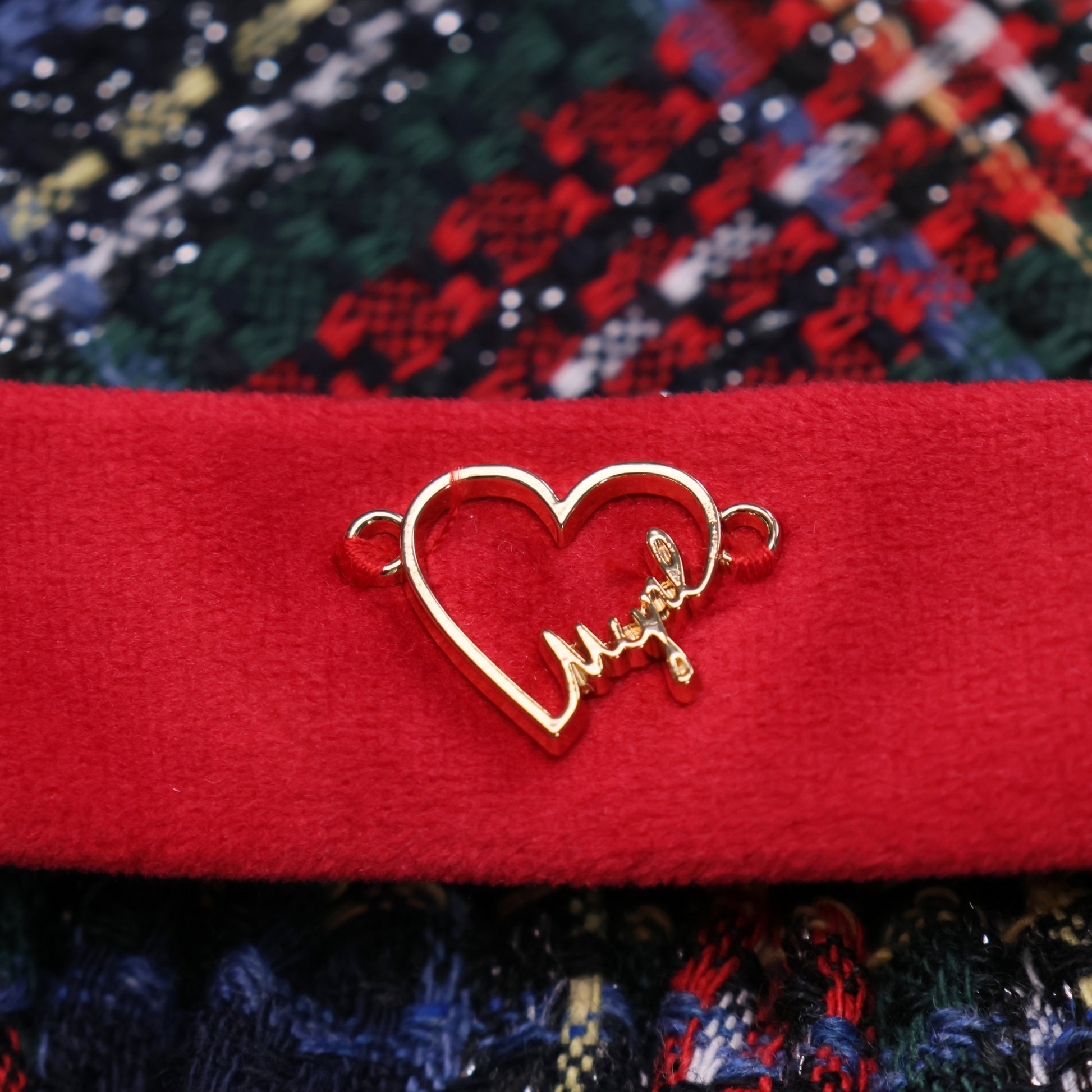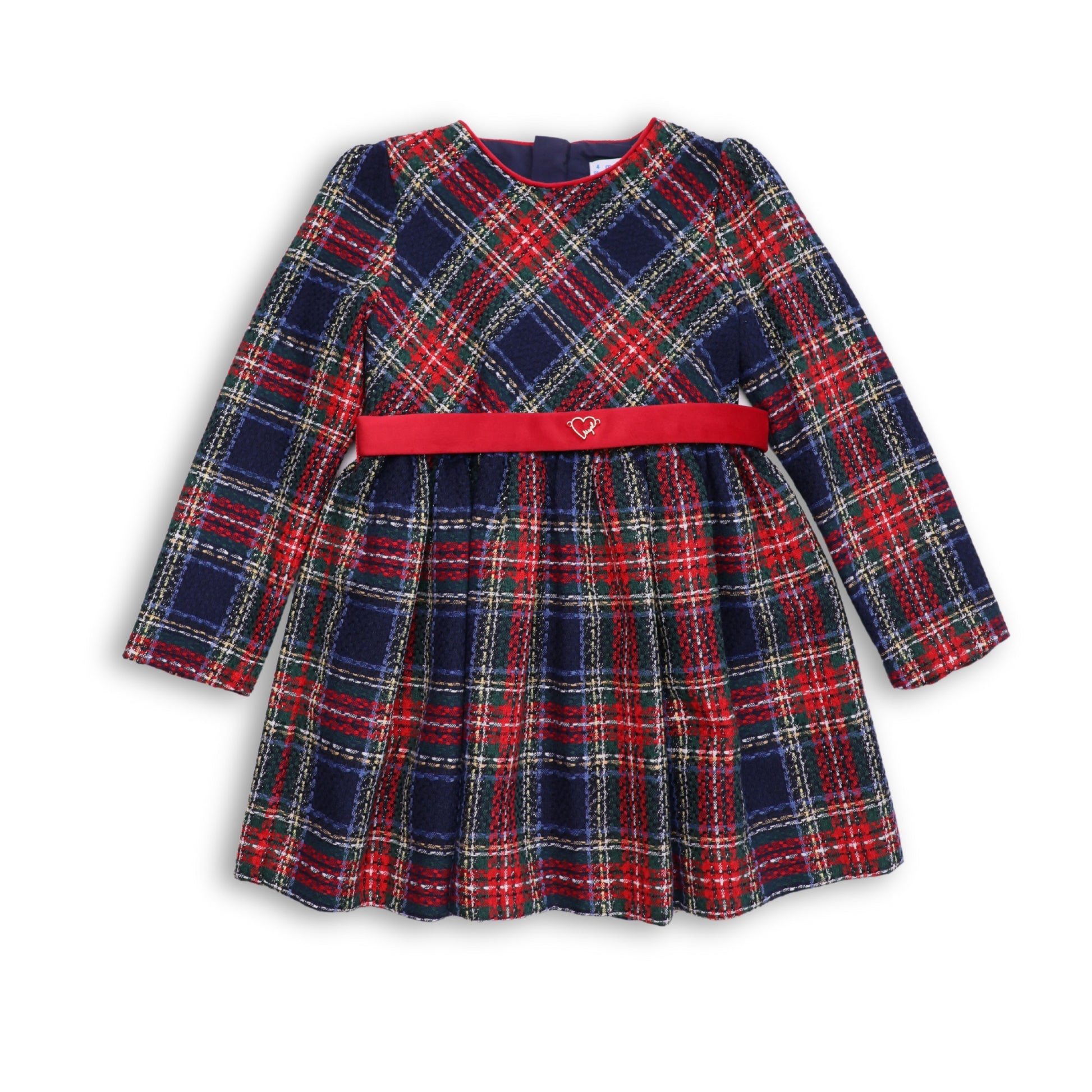 VESTIDO DE NIÑA MANGA LARGA EN TELA GRUESITA A CUADROS AZUL, ROJO Y DETALLES DORADOS CON CINTURÓN ROJO