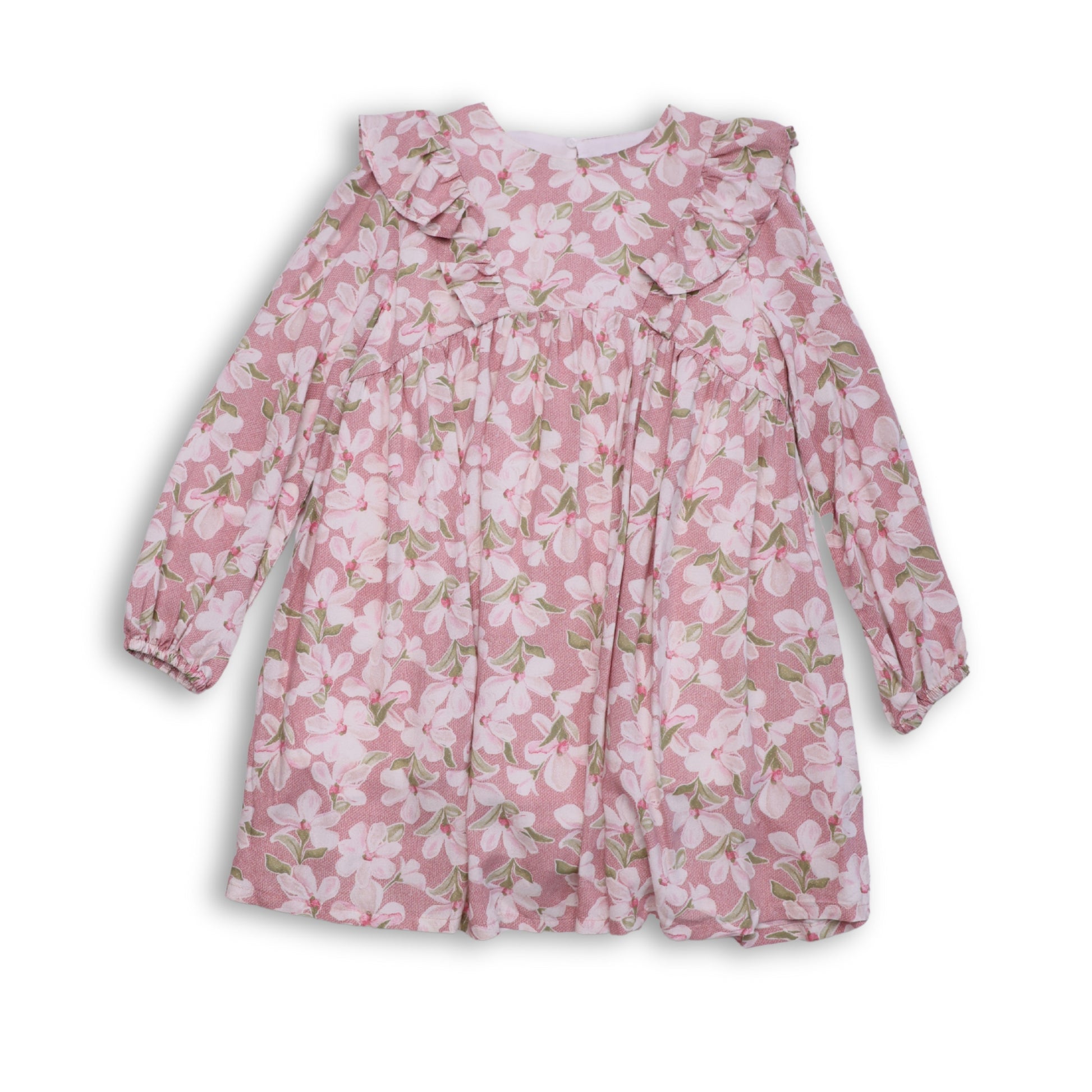 VESTIDO DE NIÑA MANGA LARGA EN TELA DELGADA COLOR PALO ROSA CON FLORES, AJUSTE EN LAS MUÑECAS Y BLONDAS DECORATIVAS