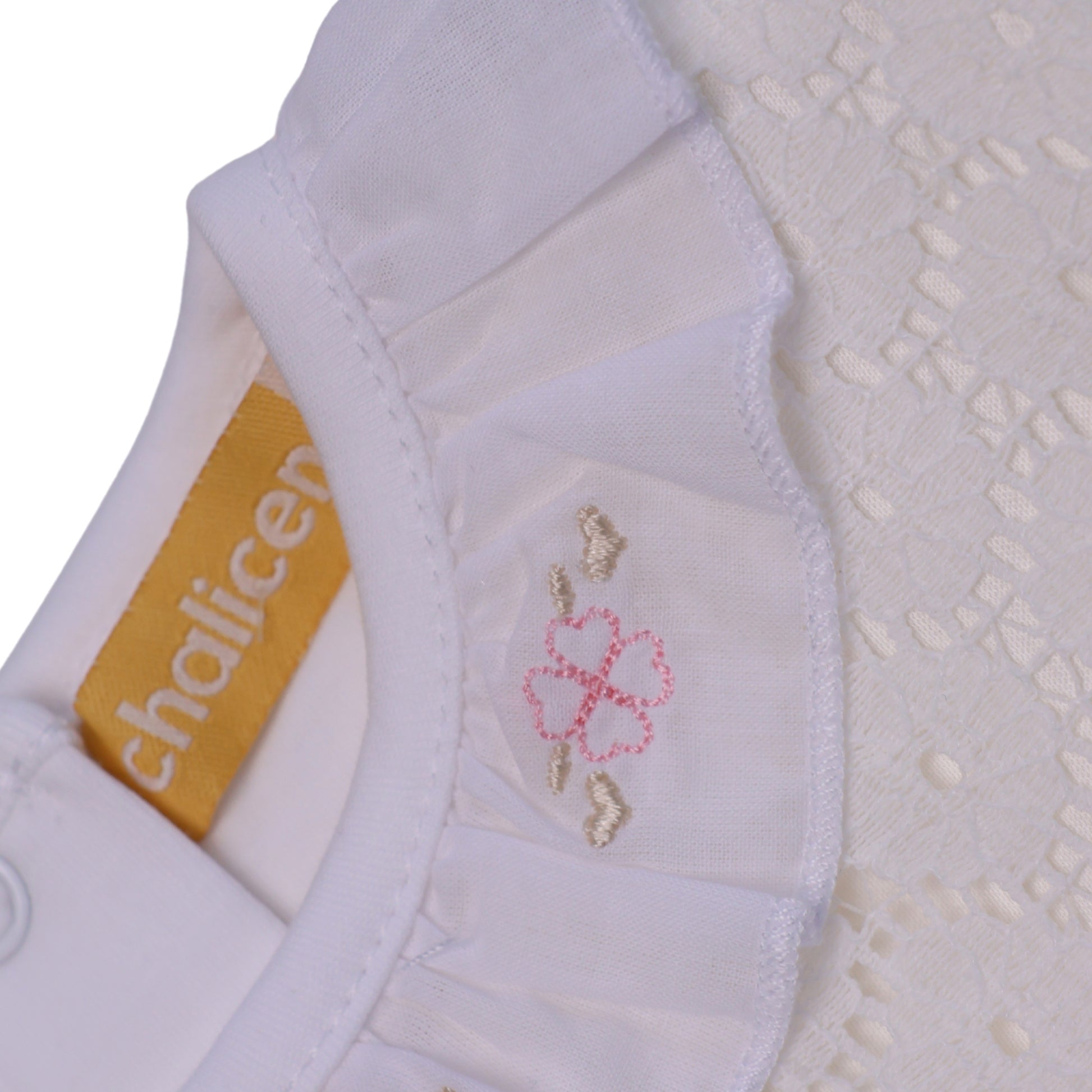 Incluye un polo manga larga blanco, con cuello bebé clásico que se luce sobre el encaje del vestido.
