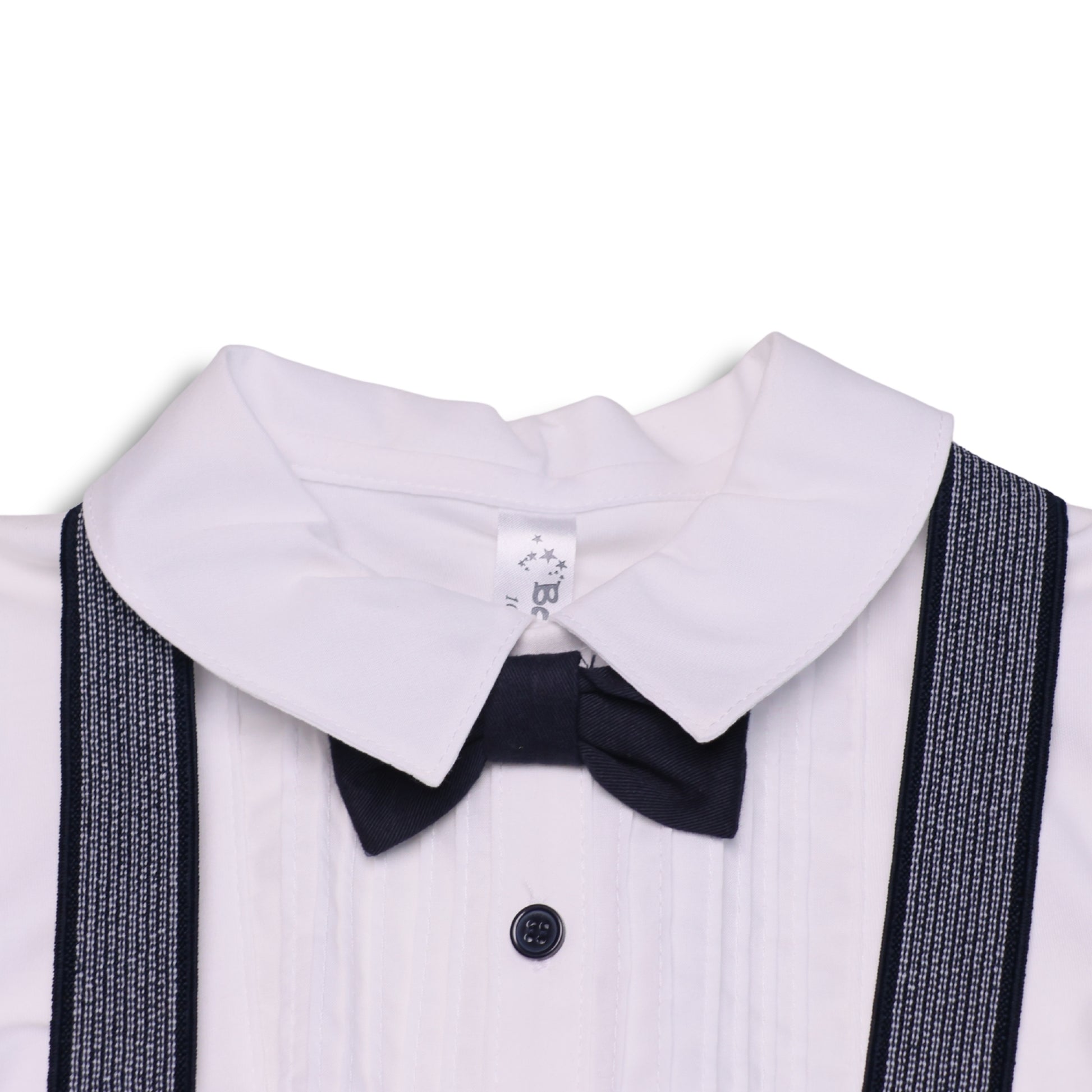 Conjunto elegante de manga larga para bebé, ideal para ocasiones especiales. Incluye una camisa 100% algodón pima, con cuello camisero, puños clásicos y un detalle encantador de tres botones al centro del pecho a tono con el pantalón, el cual se complementa con tirantes ajustables y una michi decorativa al cuello, que añade un toque tierno y sofisticado. ¡Perfecto para que tu pequeño luzca como todo un caballerito desde sus primeros pasos!
