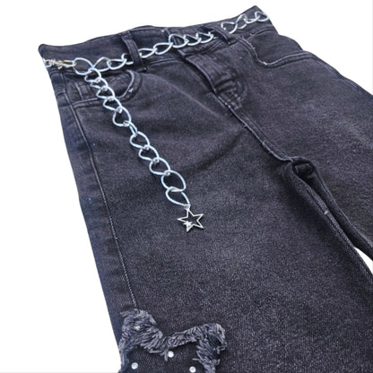 ¡Un clásico con un toque de magia! Este pantalón de denim negro con delicadas estrellas bordadas es perfecto para crear looks casuales con personalidad. Su corte palazzo brinda libertad de movimiento, mientras que la tela resistente lo hace ideal para el día a día.