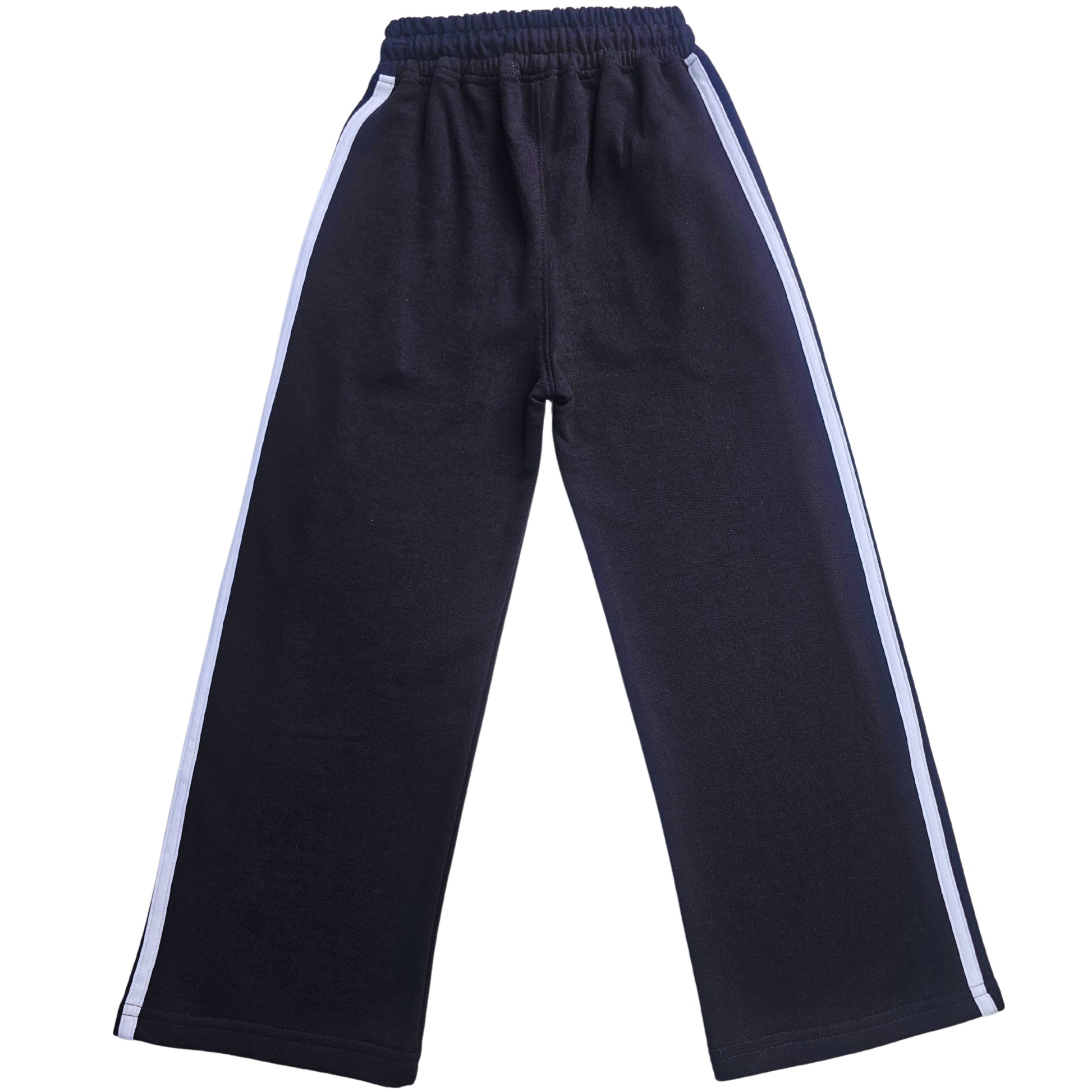 Este pantalón palazo con rayas blancas es ideal para niñas que adoran moverse con libertad y lucir modernas. Confeccionado en suave tela frechterry, su corte holgado ofrece una caída ligera y elegante que lo hace perfecto para cualquier ocasión: desde un paseo casual hasta una salida especial.