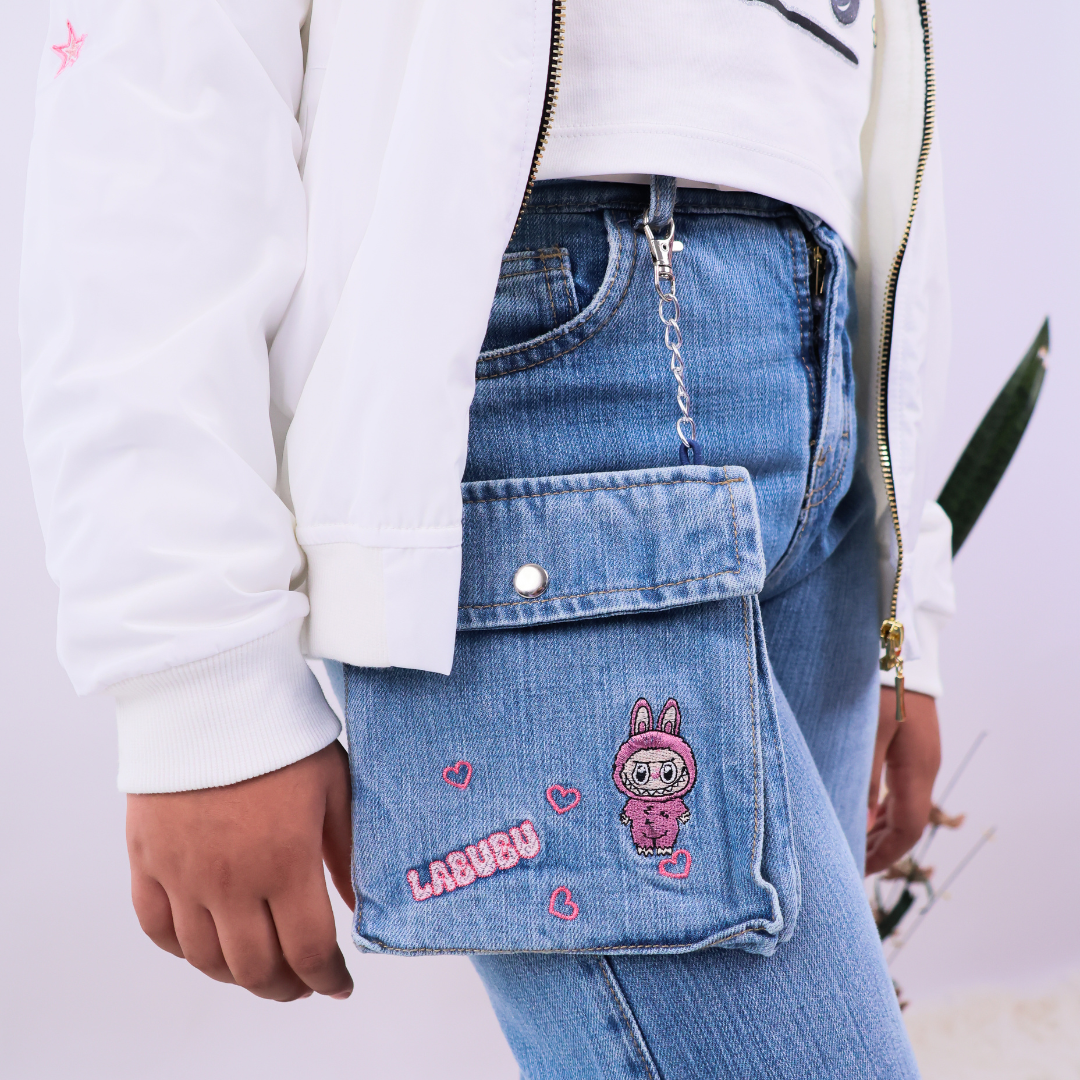 Este pantalón, palazzo, para niña no es cualquier prenda: es una explosión de estilo y ternura. Con pretina, botón y cierre delantero, brinda un ajuste cómodo y moderno. Al frente, un bolsillo tipo cartera, con un encantador bordado de Labubu, y como si fuera poco, ¡también tiene bordados adicionales de Labubu en el costado de la pierna! Un diseño pensado para niñas con mucha personalidad y amor por los detalles.