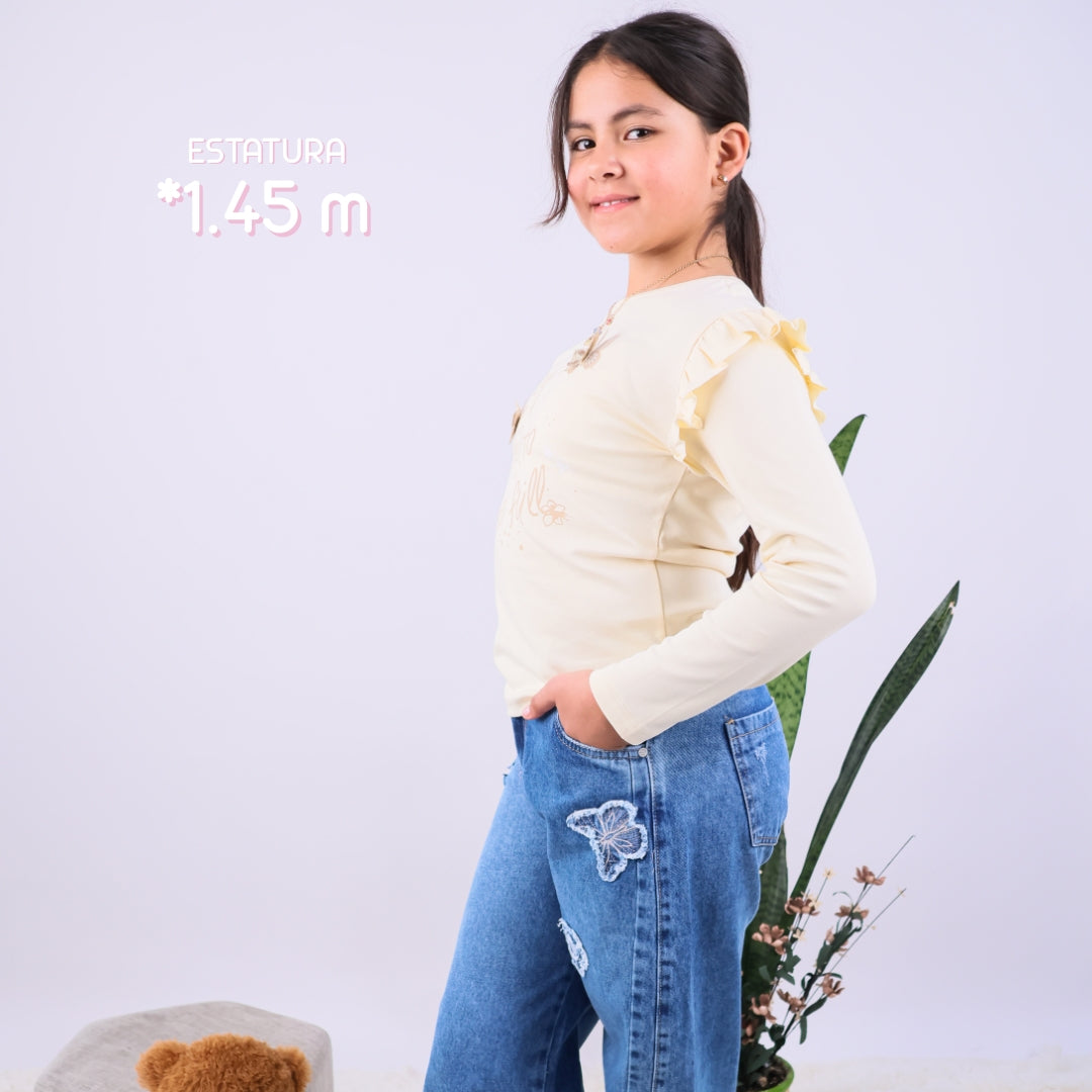 Dale un toque tierno y moderno al outfit de las más pequeñas con nuestro encantador Pantalón Slouchy Mariposas. Confeccionado en denim azul de textura suave, este pantalón destaca por su corte slouchy: amplio, cómodo y a la moda.