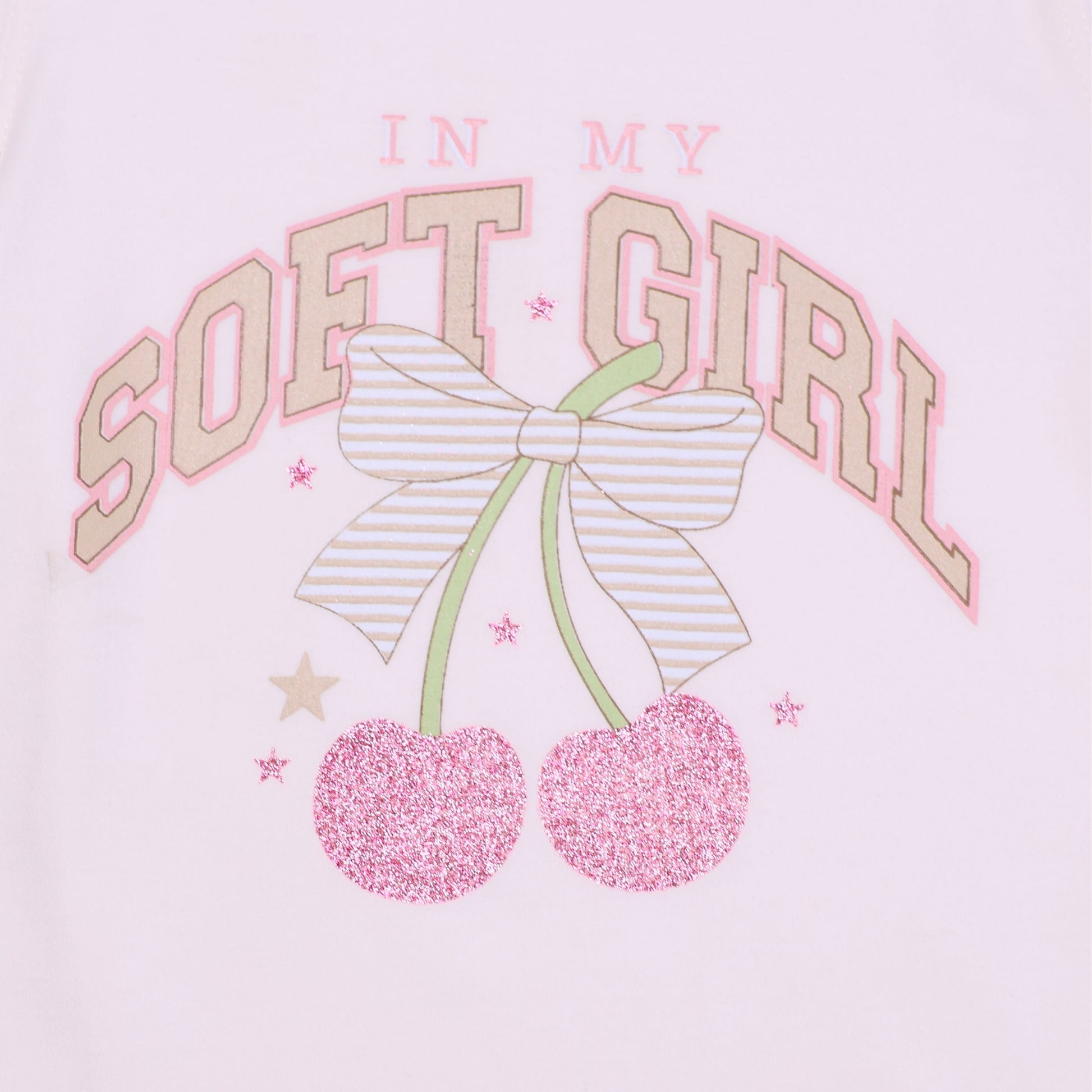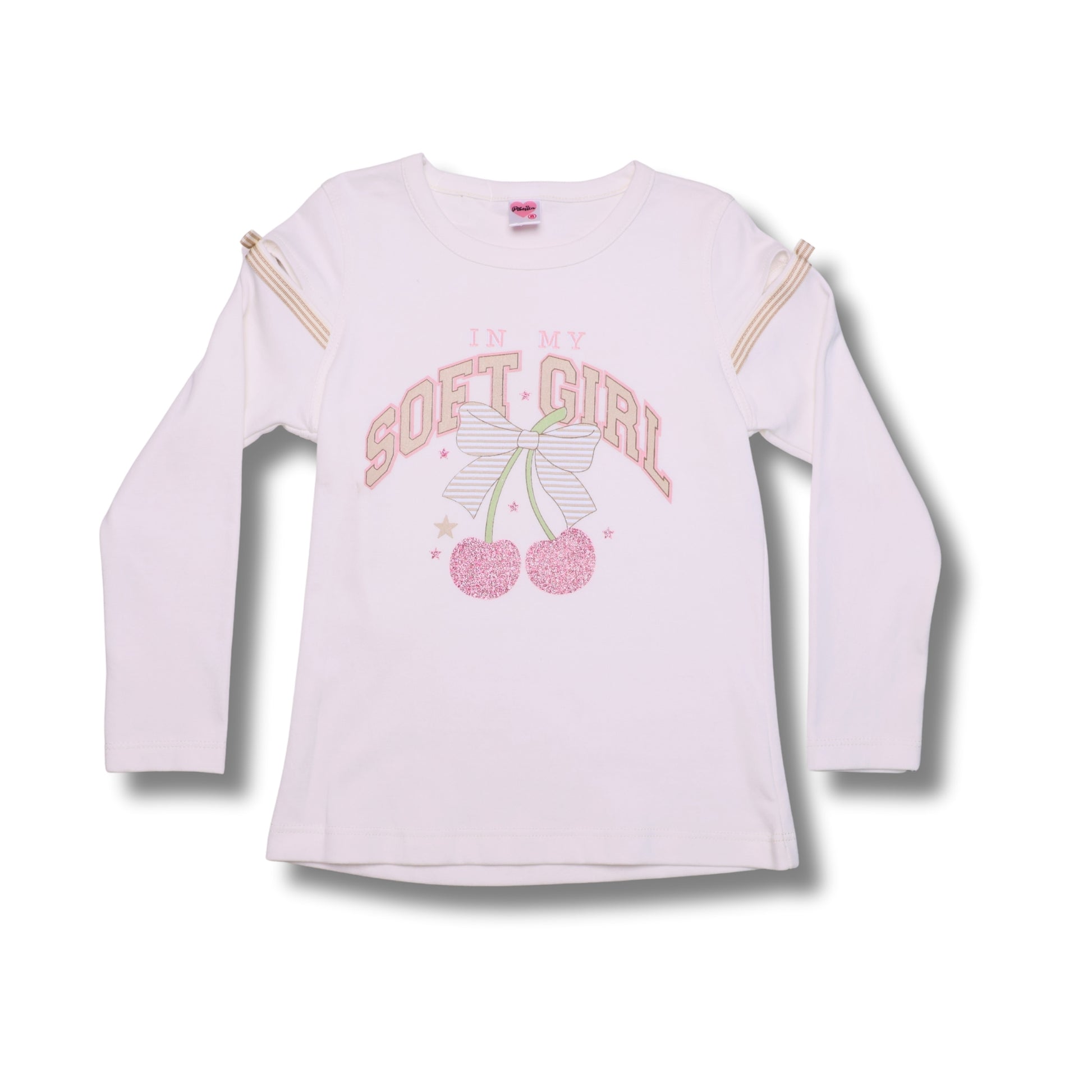 Polo manga larga para niña, con cuello redondo, confeccionado en suave algodón, 100% pima nacional, ideal para acompañarla en sus aventuras diarias con total comodidad. Presenta un encantador estampado frontal, de unas cerezas sujetas por un delicado lazo acompañado con la frase “Soft Girl”, que le da un toque dulce y moderno. Como detalle especial, incorpora unas cintas decorativas a la altura de los hombros, añadiendo un aire femenino y divertido al diseño. Perfecto para looks casuales con un guiño de estilo.